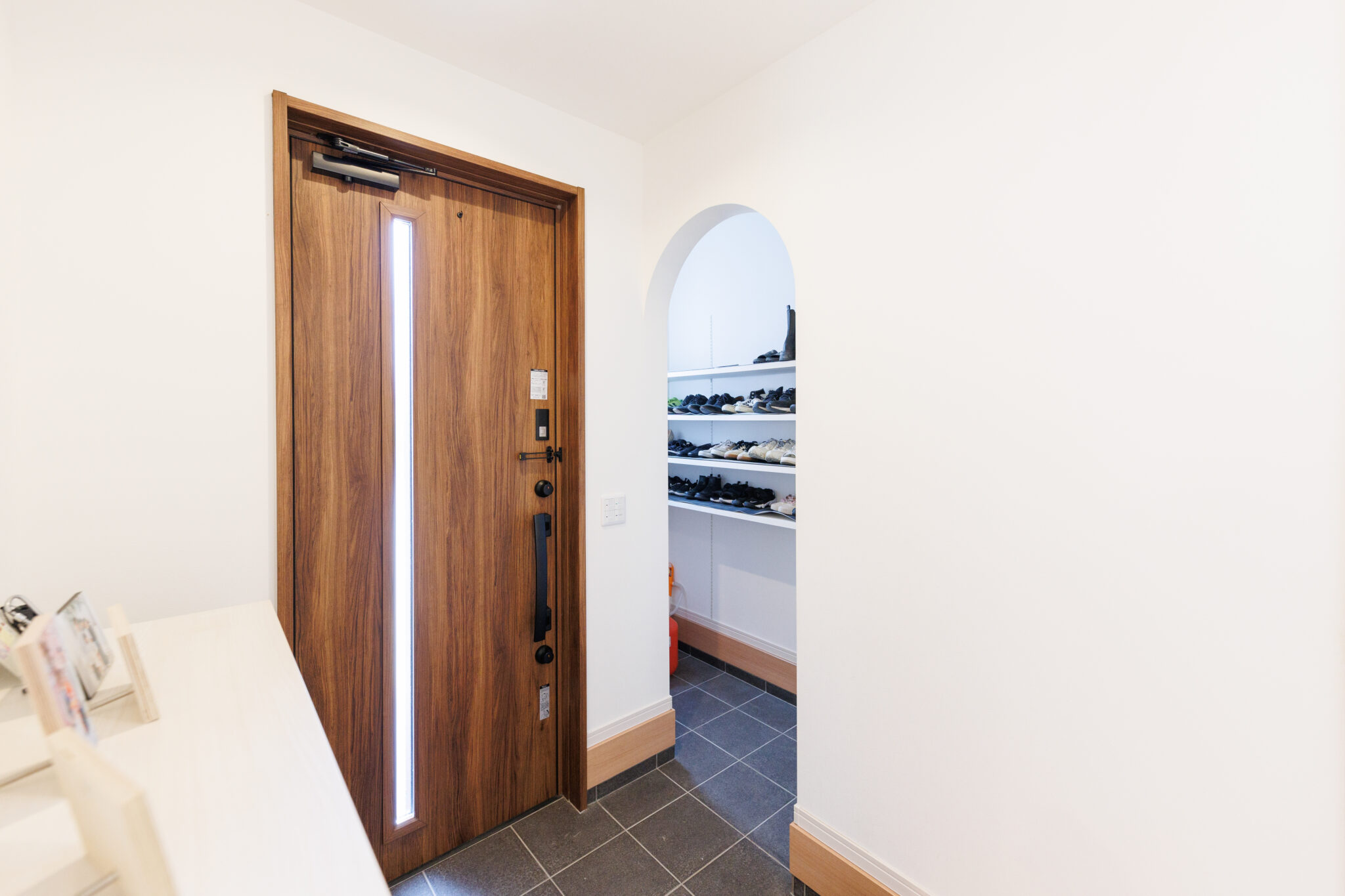木目調のドアが温かみを感じさせる玄関は、シンプルながらも上質な雰囲気を演出しています。隣にはアーチ型の入り口からつながるシューズクロークが設けられており、靴や外出用品をすっきり収納できる実用的な空間に。見た目の美しさと機能性を兼ね備えた玄関は、家族や来客を心地よく迎え入れる住まいの顔となっています。