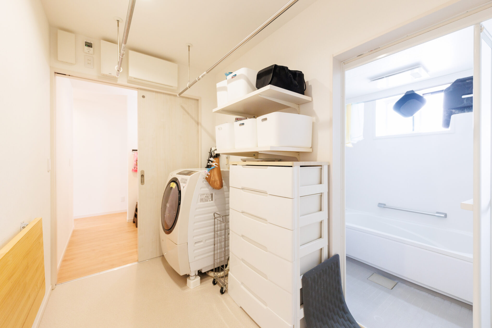 ランドリールームと脱衣所を一体化させた空間は、家事効率を高める工夫が詰まった場所。洗濯から乾燥、収納までがひと続きの動線になっていて、毎日の家事が驚くほど快適に。浴室と隣接しているため、入浴時の着替えやタオルの準備もスムーズ。天井には物干し用のバーが備え付けられ、天候を気にせず洗濯物を干せるのも大きな魅力です。