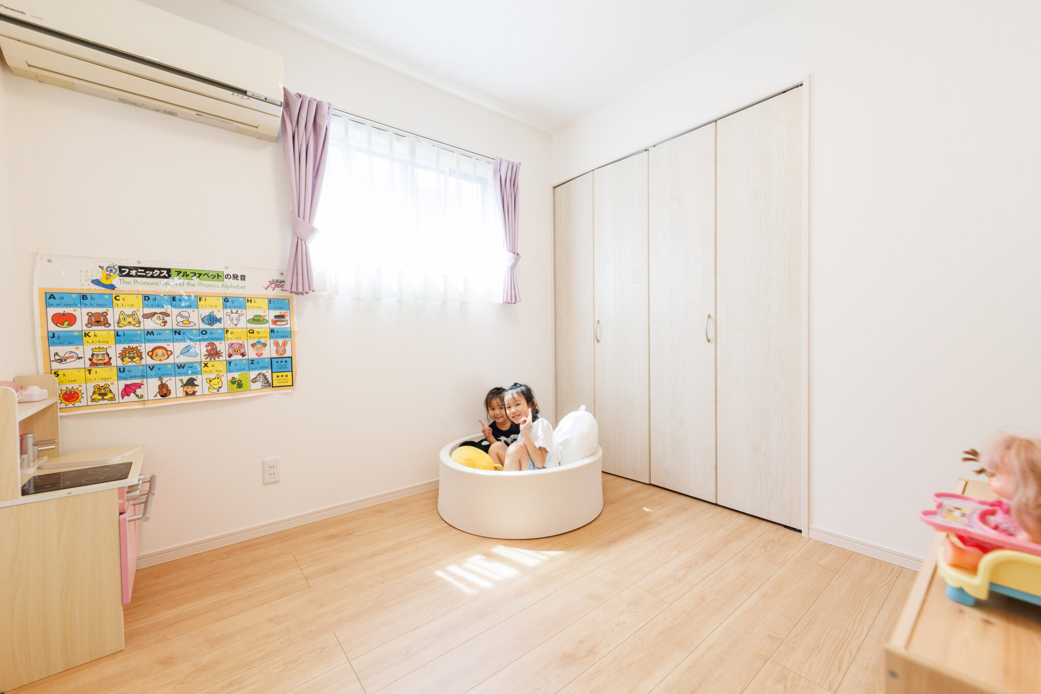 大きなクローゼットを備えた子ども部屋は、収納力も十分でお片付けがしやすい空間。シンプルで落ち着いたデザインだからこそ、子どもの成長に合わせて家具やインテリアを柔軟に変えられます。窓から差し込むやわらかな光が部屋全体を包み込み、安心して過ごせる雰囲気に。プライベートな空間としての心地よさも大切にした子ども部屋です。