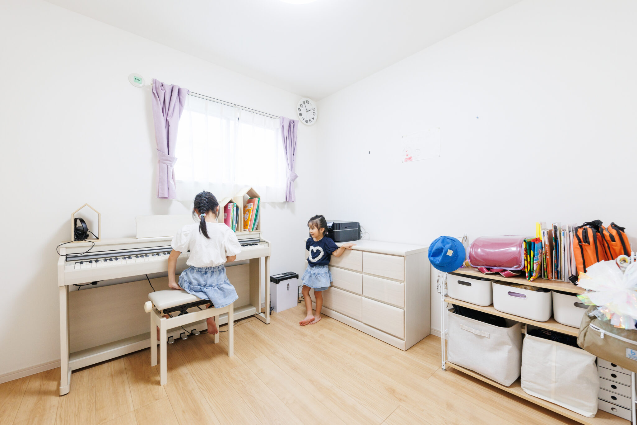 明るくシンプルな子ども部屋は、成長に合わせて自由にアレンジできる柔軟な空間。ピアノを置いて音楽を楽しんだり、学習や遊びのスペースとして活用したりと、多目的に使えるのが魅力です。 収納棚も備えられており、学用品やおもちゃを整理しやすく、すっきりとした環境を保てます。子どもたちが自分のペースでのびのびと過ごせる場所となっています。