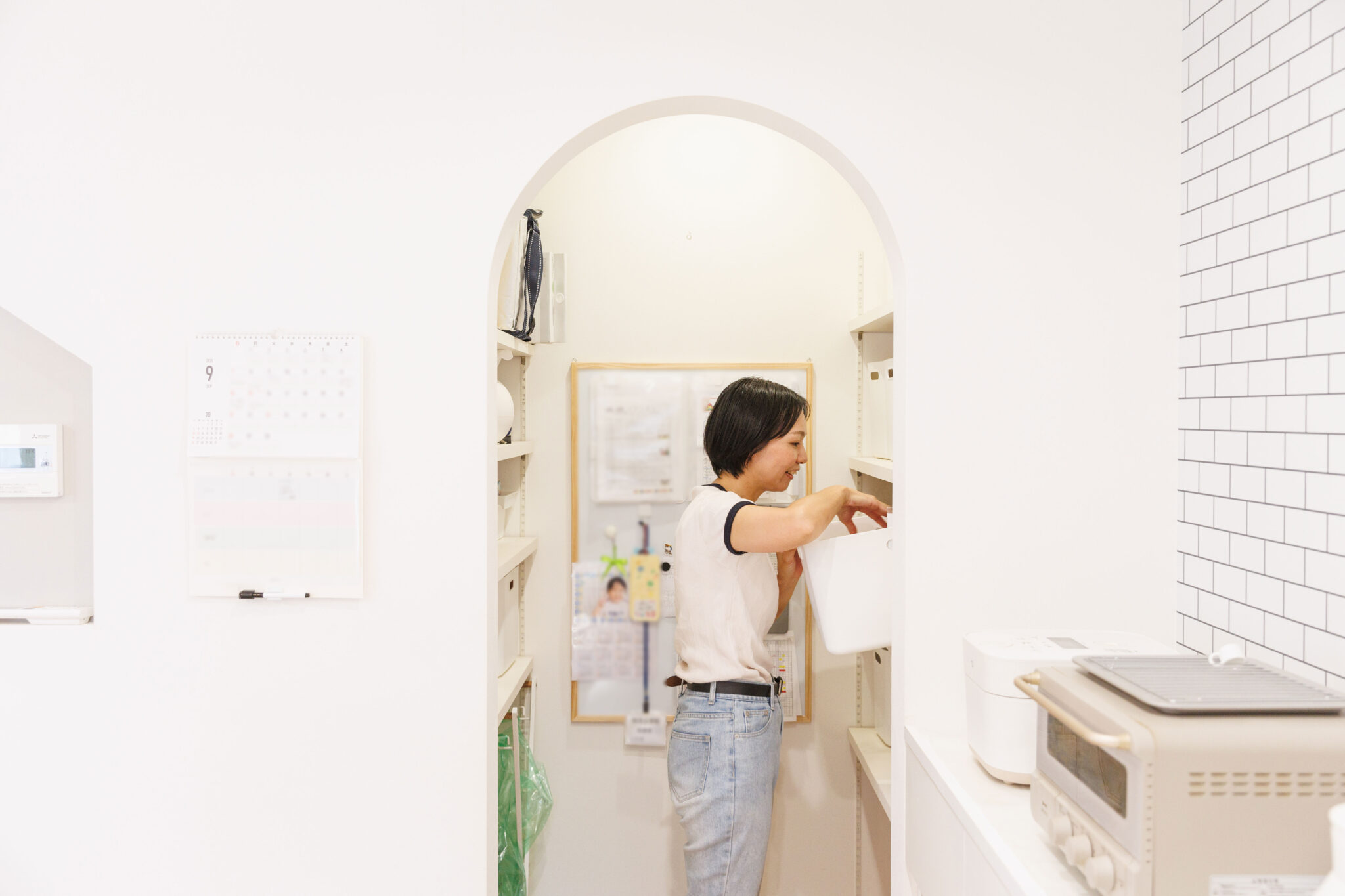 キッチン横に設けられたパントリーは、アーチ型の入り口がアクセントになった可愛らしい空間。棚には食品や日用品をすっきりと収納でき、暮らしをより快適にサポートします。扉を設けないオープンなスタイルで、使いたいものにすぐ手が届く利便性も魅力。整理整頓がしやすく、日々の家事がスムーズになります。