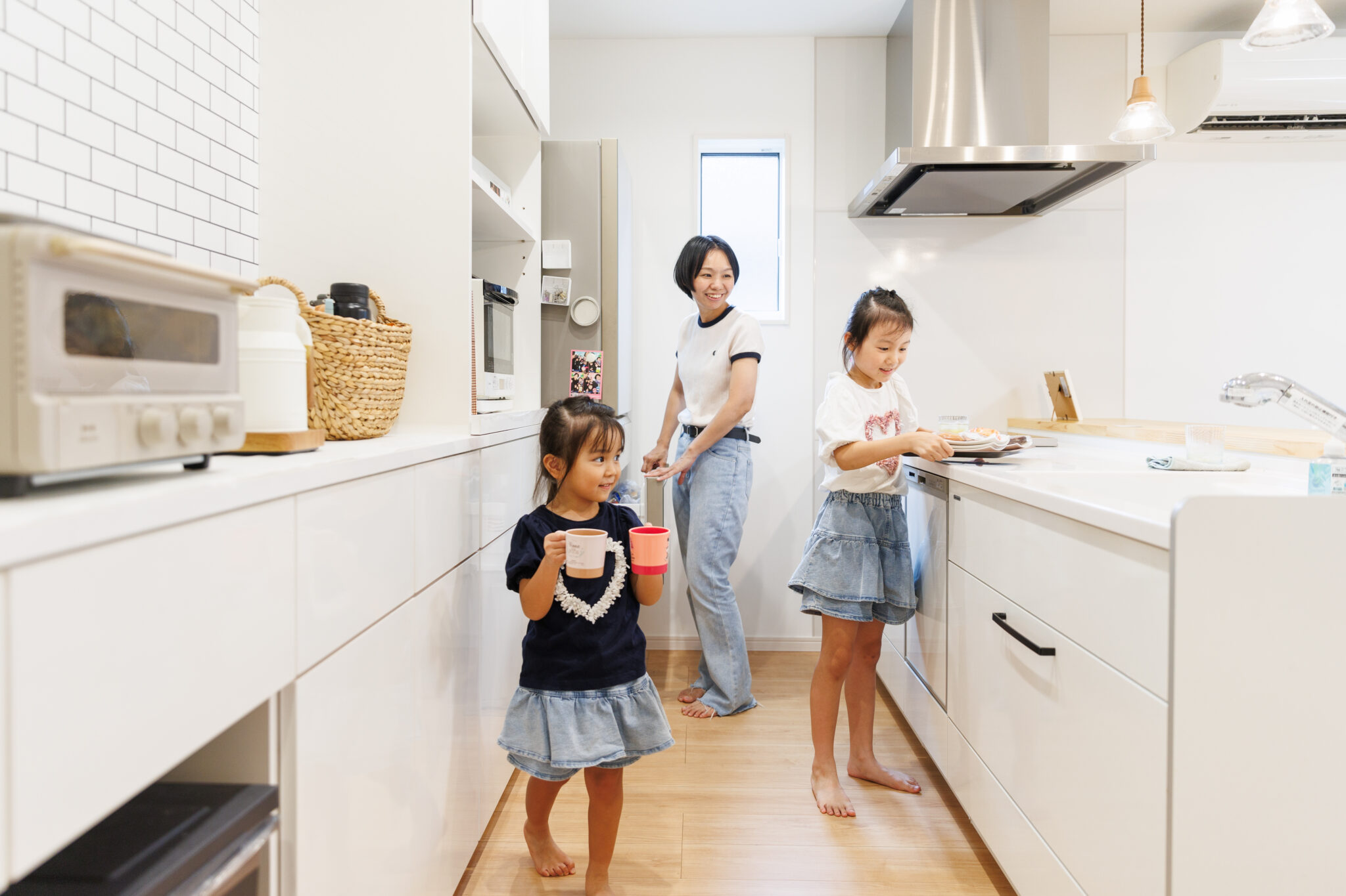 白を基調とした清潔感あふれるキッチンは、家族の動線を意識した使いやすい設計。背面収納もたっぷり確保されており、生活感を抑えながら整然とした空間を保てます。作業スペースが広く、調理や配膳もスムーズ。子どもたちも自然にお手伝いに参加できる雰囲気で、日々の家事が家族の楽しい時間につながっています。