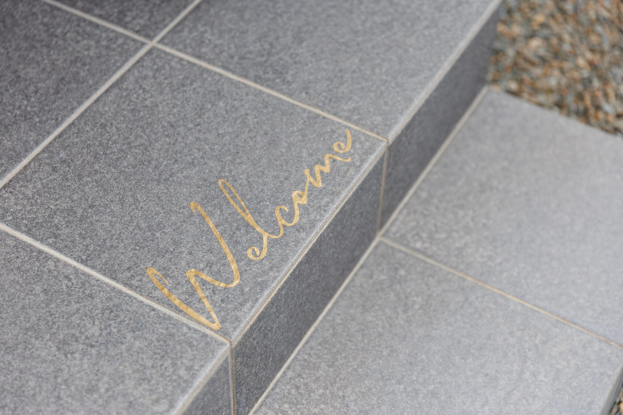 玄関ポーチには、落ち着いた色合いのタイルを採用。シンプルながらも上品さを感じさせ、住まい全体の雰囲気を引き締めています。ステップには「Welcome」の文字があしらわれており、訪れる人を温かく迎えるワンポイントに。毎日の出入りを少し特別にしてくれる、さりげないデザインが魅力の玄関ポーチです。
