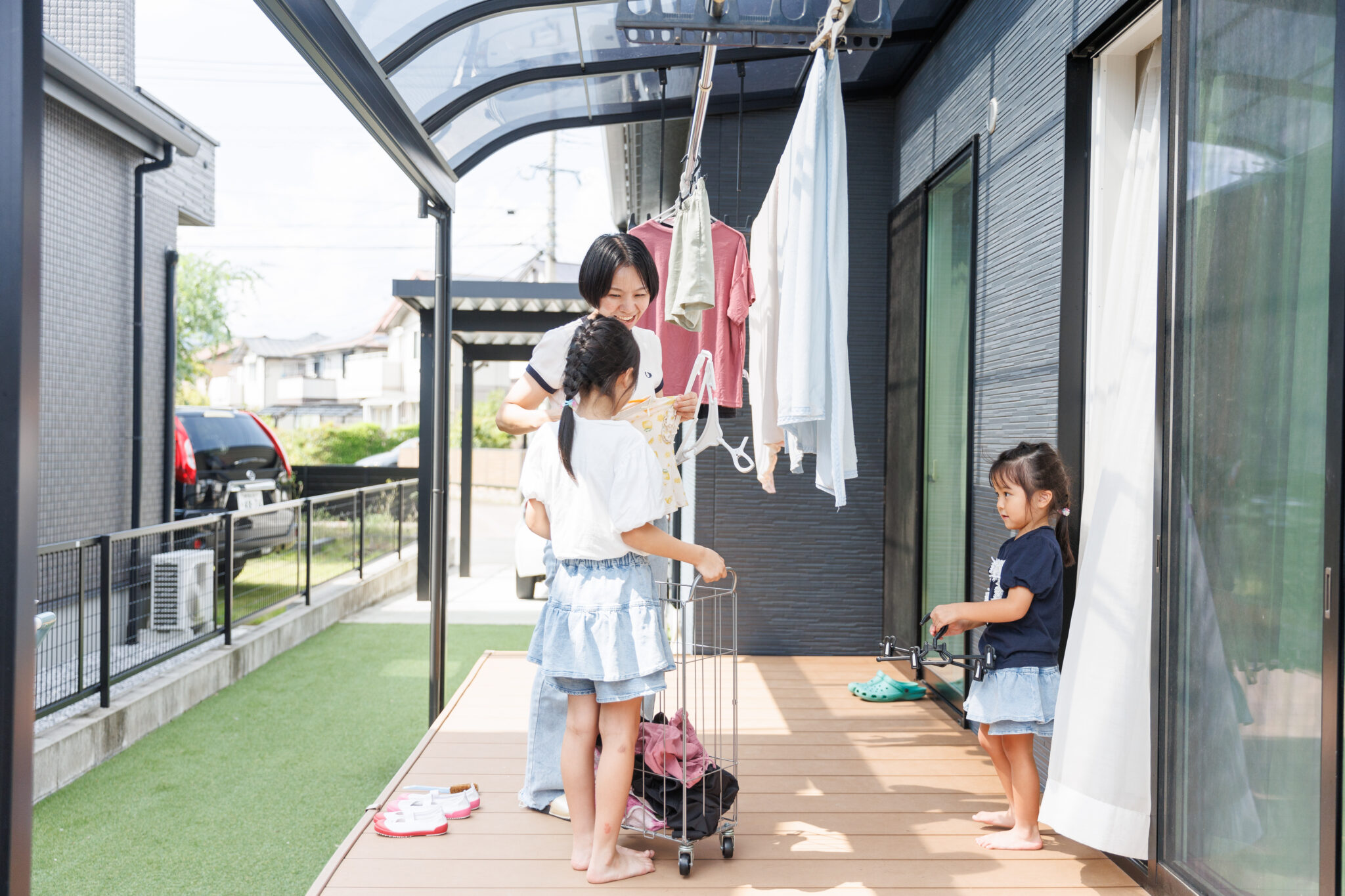 屋根付きのデッキスペースは、洗濯物干しに大活躍。天候を気にせず外干しができる安心感と、室内から直接出入りできる便利さが魅力です。子どもたちは洗濯を手伝ったり、ちょっとした遊び場にしたりと、多目的に活用できる場所。 日々の家事を支えながら、家族のふれあいのシーンも自然に生まれる空間になっています。