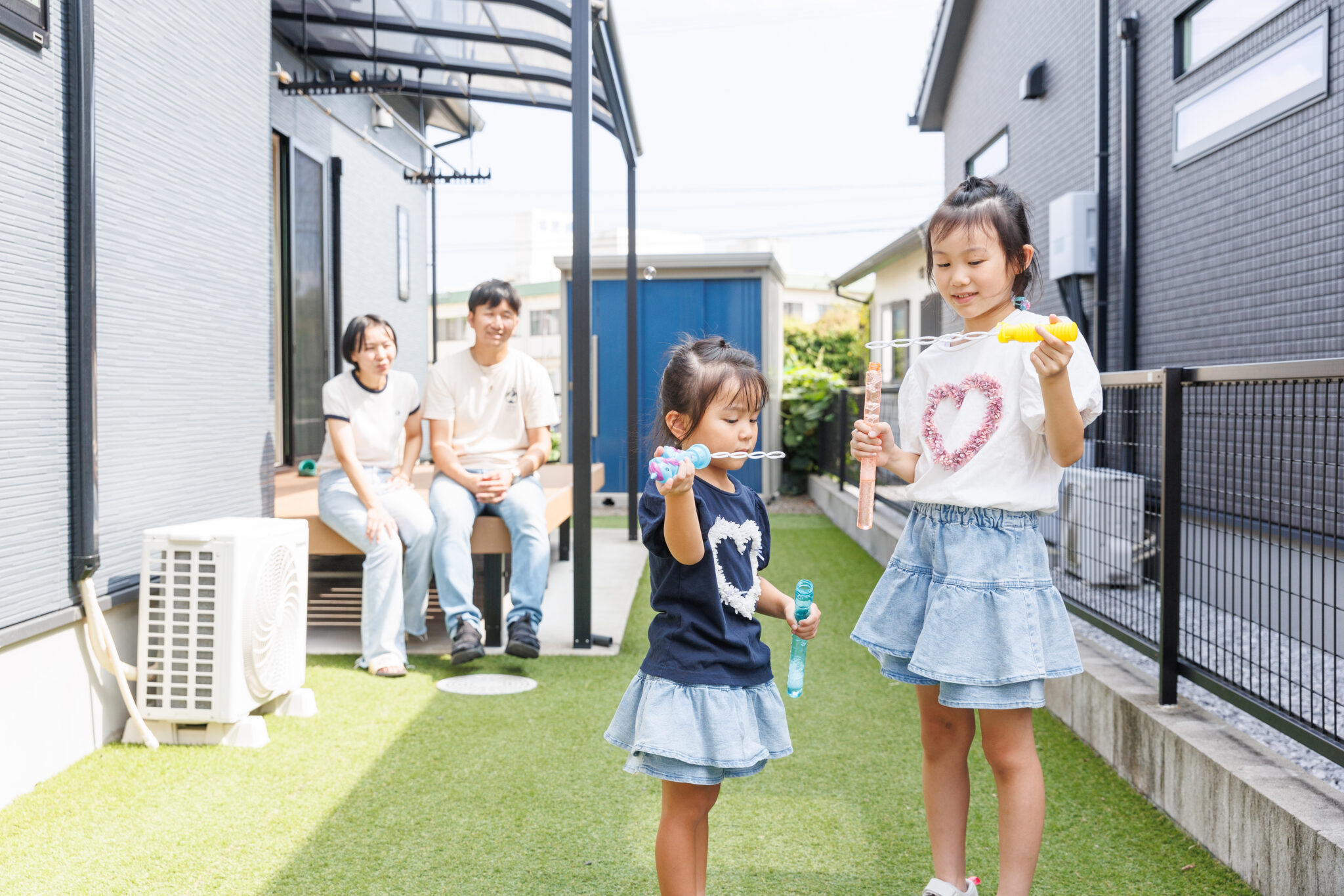 人工芝が敷かれた庭は、子どもたちが安心して遊べるお気に入りの場所。しゃぼん玉で遊ぶ笑顔が映えるように、のびのびと過ごせる開放感があります。デッキに腰掛けて見守る家族の姿からは、子どもたちと大人の距離が自然に近くなるあたたかな雰囲気が感じられます。遊び場でありながら、家族の団らんを育む大切な空間です。