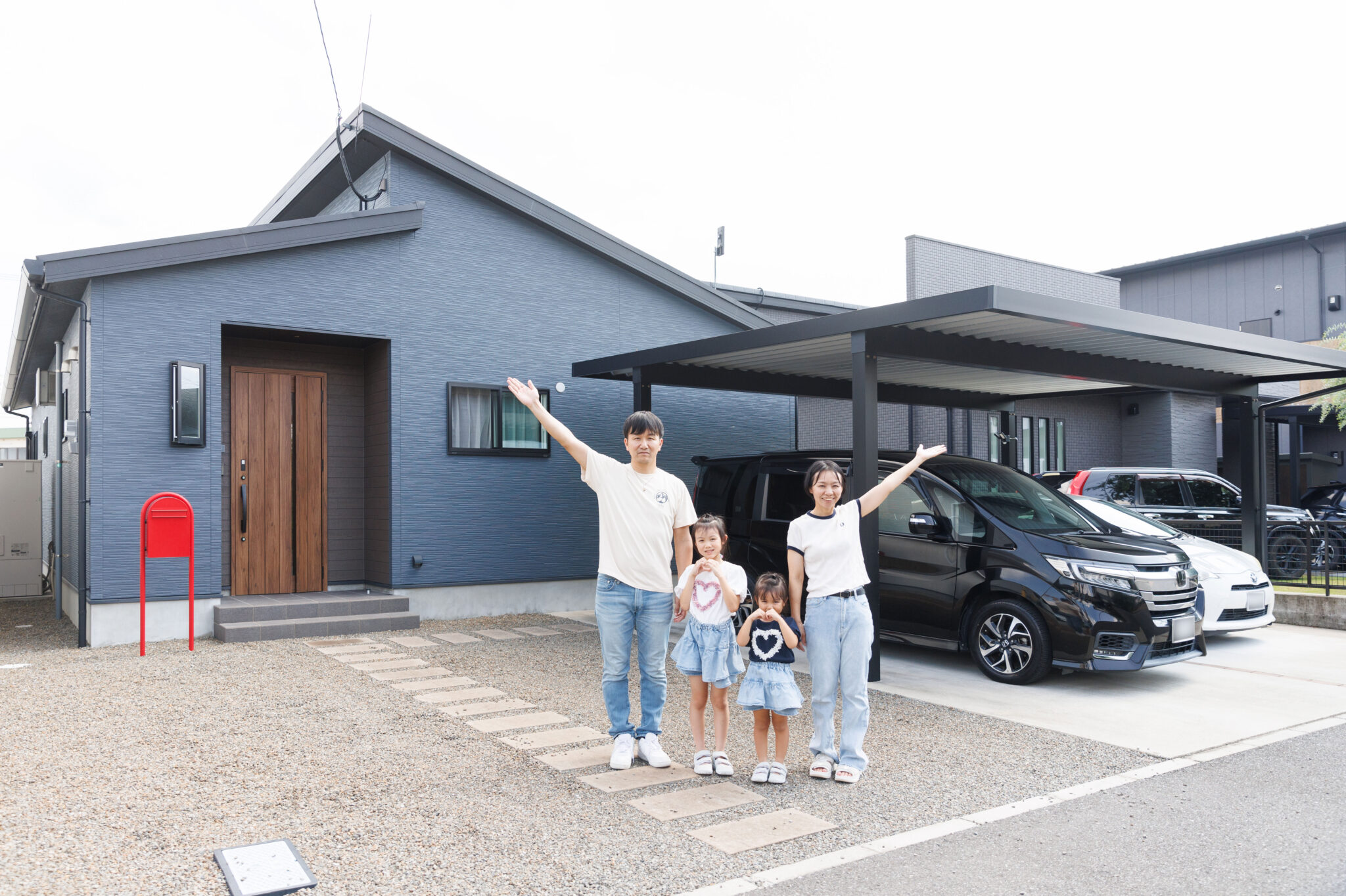 落ち着いたブルーの外壁に木目調の玄関ドアが映える、スタイリッシュな外観。シンプルながらも洗練されたデザインは、モダンでありながら温かみも感じられます。カーポートは2台分の駐車スペースをしっかり確保し、日常の使い勝手も良好。アクセントとなる赤いポストが外観全体を引き締め、個性をプラスしています。家族の暮らしを支える実用性と、街並みに調和するデザイン性を兼ね備えた住まいです。