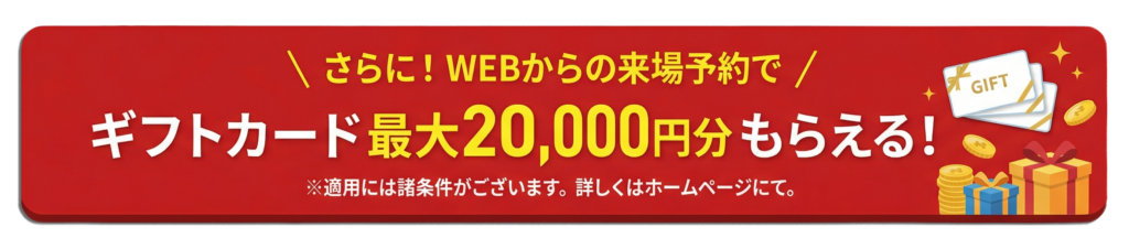 ギフトカード最大2万円分プレゼント対象 今すぐ来場予約する >