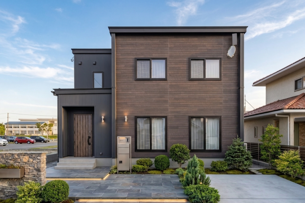 ダークでウッディな外壁でクールな印象を与える外観