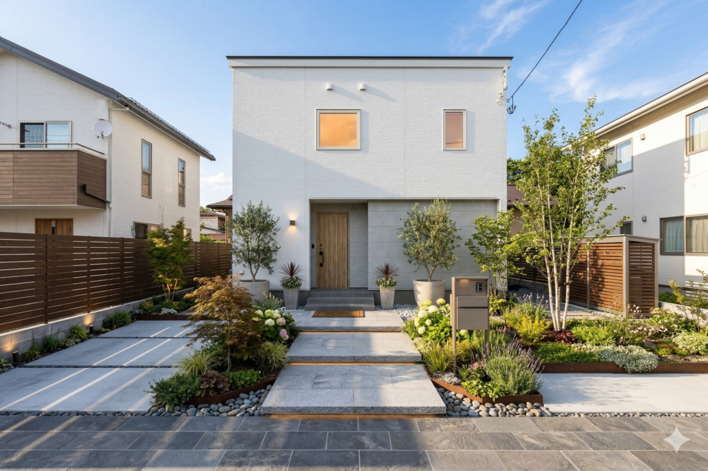 白でまとめた外観に木目調の玄関でアクセントを