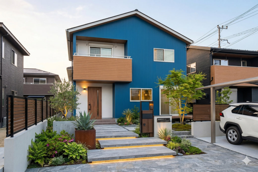 青を基調としたシンプルモダンな外観